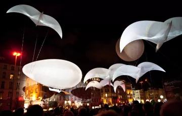 Cette création poétique des compagnies Aérosculpture et Quidam, associées à l’accordéoniste Nano, arracha le public à la réalité grâce à de grands oiseaux blancs s’envolant au-dessus de la Maine. Dans les airs, ils folâtrèrent et exécutèrent un ballet majestueux porté par la partition envoûtante d’un orchestre.