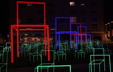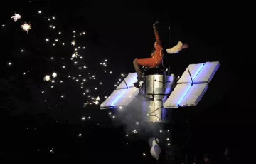 Les imposantes roues colorées de la Compagnie Off, hautes de 7 à 11 mètres et mues par d’étranges créatures, déambulèrent dans le centre-ville en se livrant à une chorégraphie enfiévrée, sur fond de musique électro.