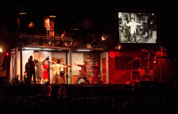 Un film inspiré des polars américains des années 50, tourné face aux spectateurs, avec diffusion instantanée sur écran géant ! Ce fut l’étonnante proposition de la compagnie La Française des comptages, qui déploya les décors de son camion studio sur la place de la Rochefoucauld. Le public, époustouflé, fut même acteur de ce nouveau chef-d’œuvre du 7ème art.