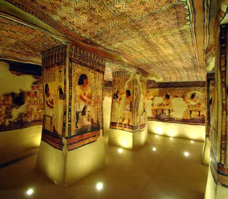 À quelques mètres, la « tombe aux vignes » de Sennefer, gouverneur de Thèbes, déploie ses quatre piliers et superbes ornements. Sur les murs, apparaissent là aussi des peintures murales représentant les rituels du cheminement vers le repos éternel, parmi lesquels l’offrande des amulettes, les purifications, l’invitation au repas, la navigation vers Abydos, la renaissance… Le tout restitué via transfert de photographies sur relief, par la société ayant déjà œuvré à la reproduction d’une salle de la grotte de Lascaux.